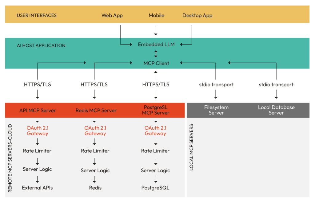 Key choices: use stdio for local filesystems and same-host resources, switch to HTTP for cloud services or databases; keep MCP servers stateless so you can scale horizontally without coordination overhead; terminate OAuth at the edge so authentication completes before any request reaches tool logic; enforce rate limits to protect downstream systems from bursty traffic and overactive agents.