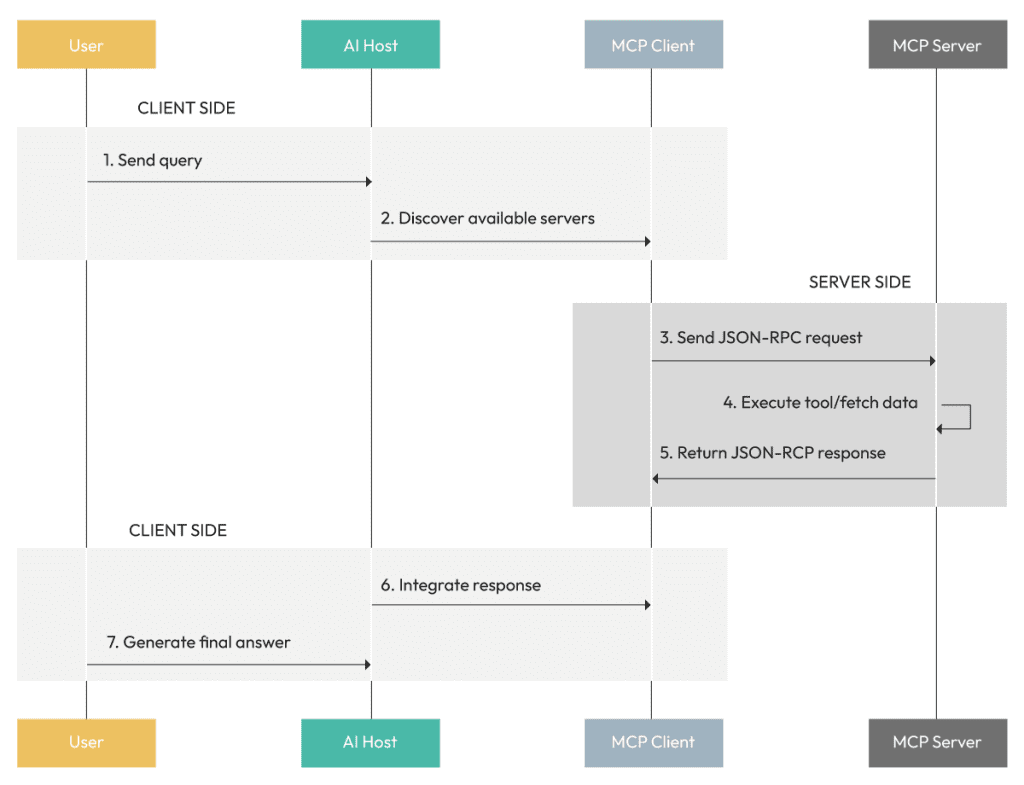 At its core, MCP uses a simple client–server pattern. The AI runtime acts as the client that discovers and invokes tools. External systems expose capabilities through MCP servers. Requests and responses flow via JSON-RPC 2.0 over common transports such as stdio, or HTTP, which keeps implementation details straightforward and portable.