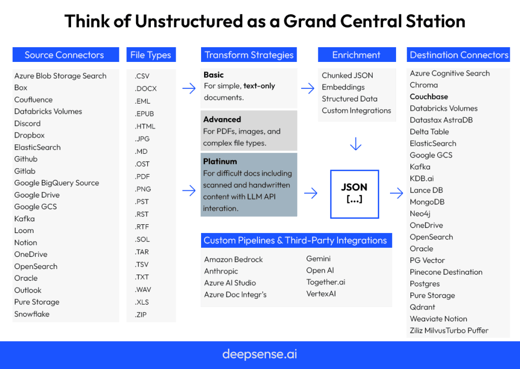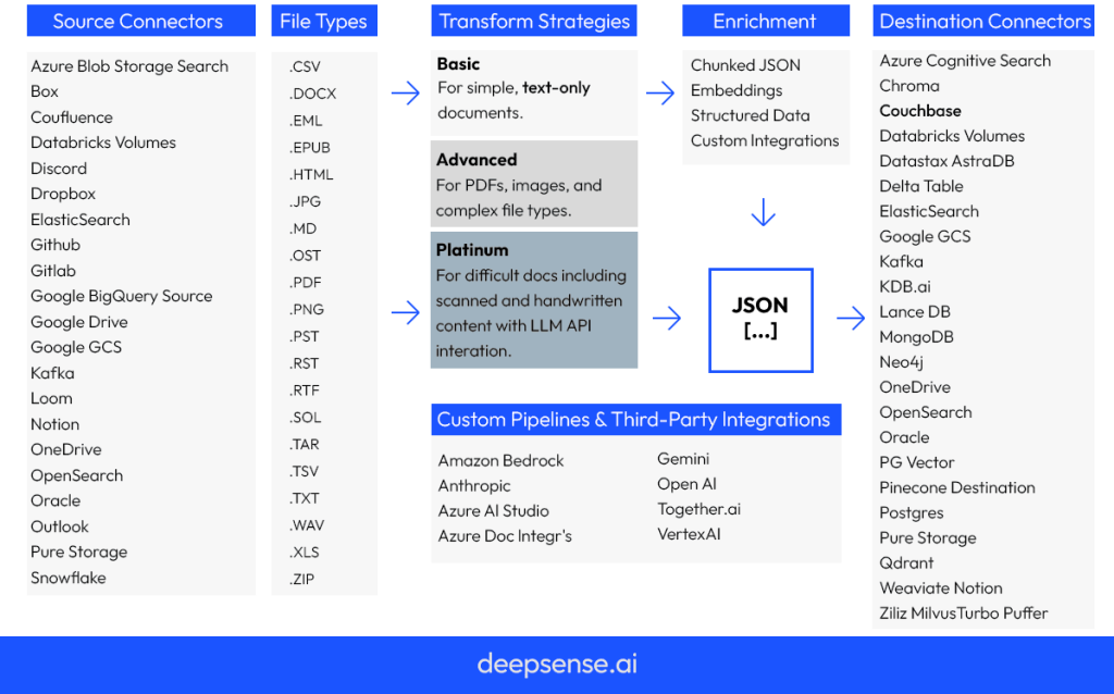 The client’s data processing platform needed to integrate with 35+ data sources, 35+ destinations, and 10+ AI model providers across 65+ file types – each with different APIs, rate limits, and security requirements. Handling unstructured data (PDFs, images, Word docs) efficiently was essential to meet enterprise-grade demands across AWS, Azure, and on-prem deployments.
