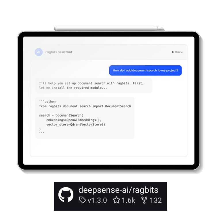 ragbits is a production-ready GenAI framework backed by real engineering experience and an active open-source community, with 1,600+ GitHub stars and 130+ forks.
