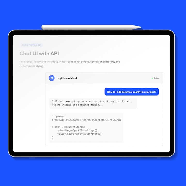 ragbits ships with a Chat UI, authentication, and API layer. No infrastructure work required – deploy a working system and put it in front of stakeholders immediately.